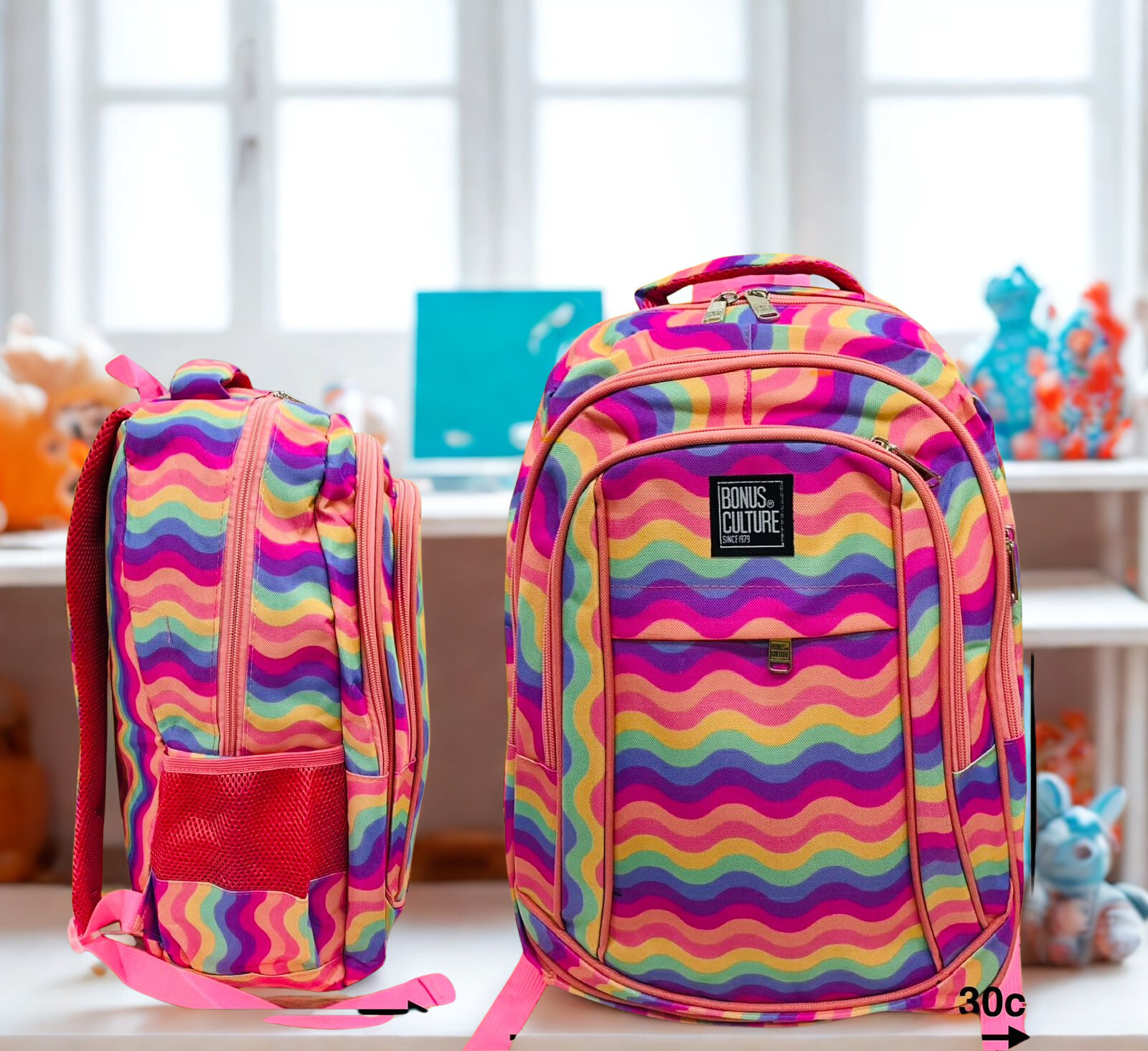 Este bolso juvenil estampado destaca por su diseño vibrante y dinámico de ondas multicolor, combinando una estética alegre con una estructura robusta y funcional. Es el compañero ideal para estudiantes que necesitan organizar múltiples útiles escolares con comodidad y estilo.