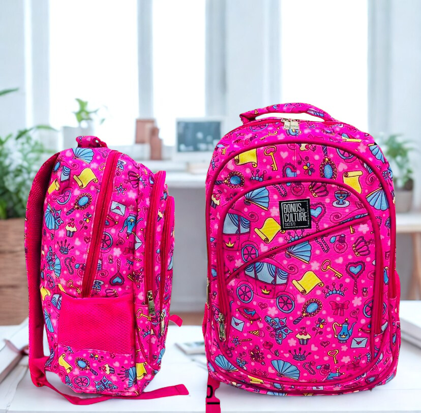 + Free ShippingEste bolso juvenil estampado presenta un diseño encantador y detallado con motivos de princesas, coronas, llaves mágicas y carruajes sobre un fondo fucsia vibrante. Es la opción perfecta para quienes buscan un accesorio que combine un estilo fantástico con la resistencia necesaria para la jornada escolar.