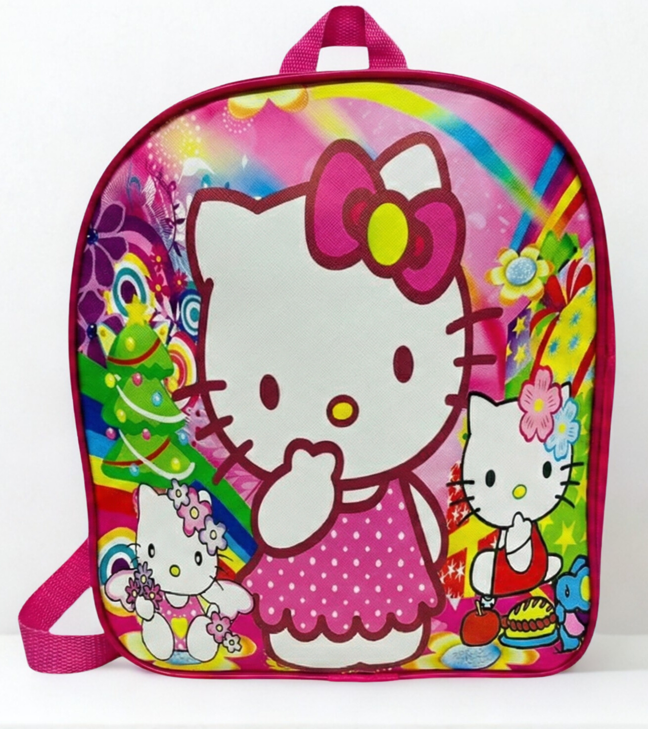 Estampado multicolor de Hello Kitty con flores, arcoíris y detalles alegres; laterales y espalda en color fucsia.