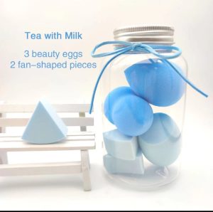 Pack de esponjas de maquillaje presentadas en un frasco transparente con tapa metálica y lazo decorativo. Incluye distintas formas y colores para aplicar base, corrector y polvos, logrando acabados suaves y naturales. Son lavables y reutilizables, perfectas para el uso diario.