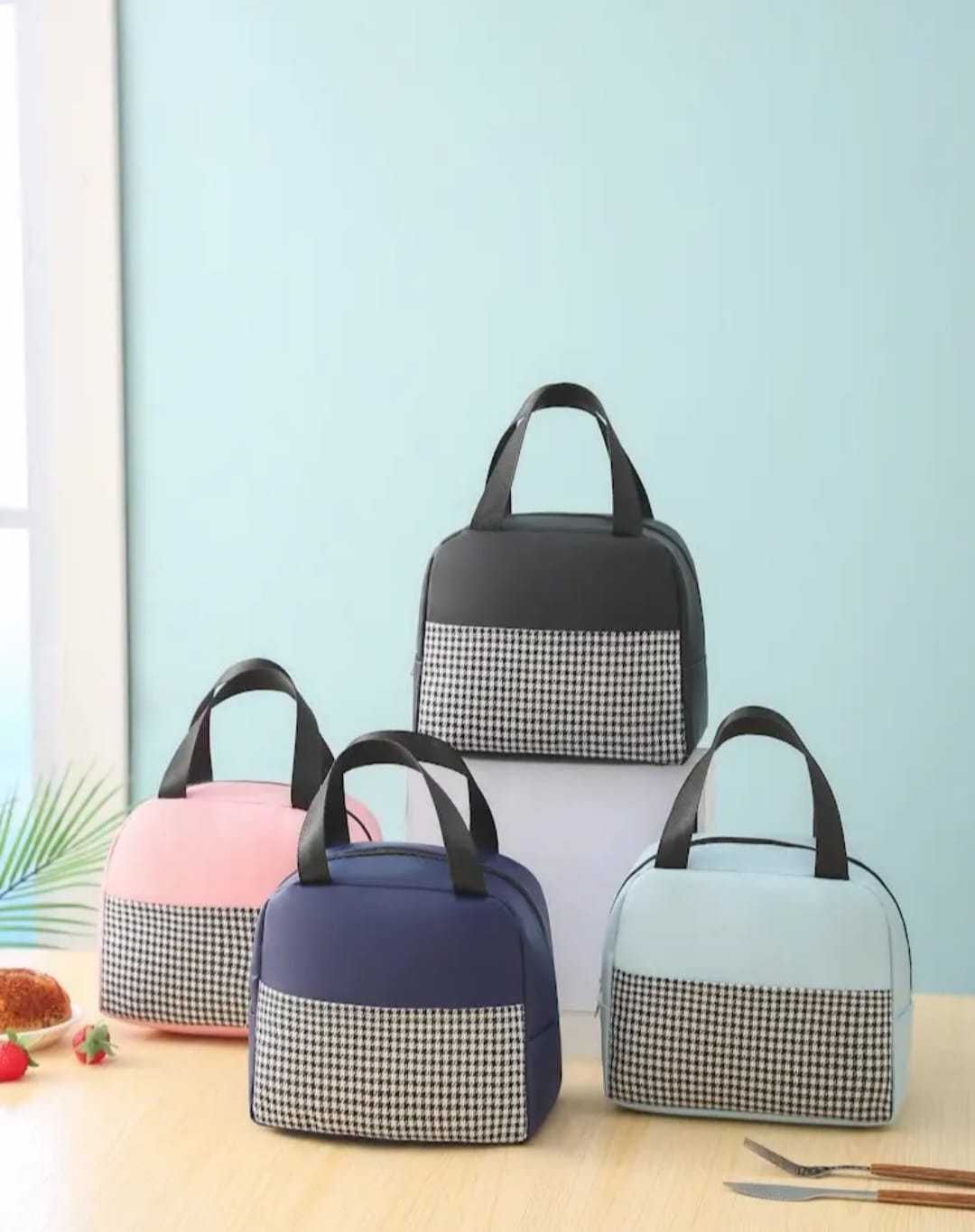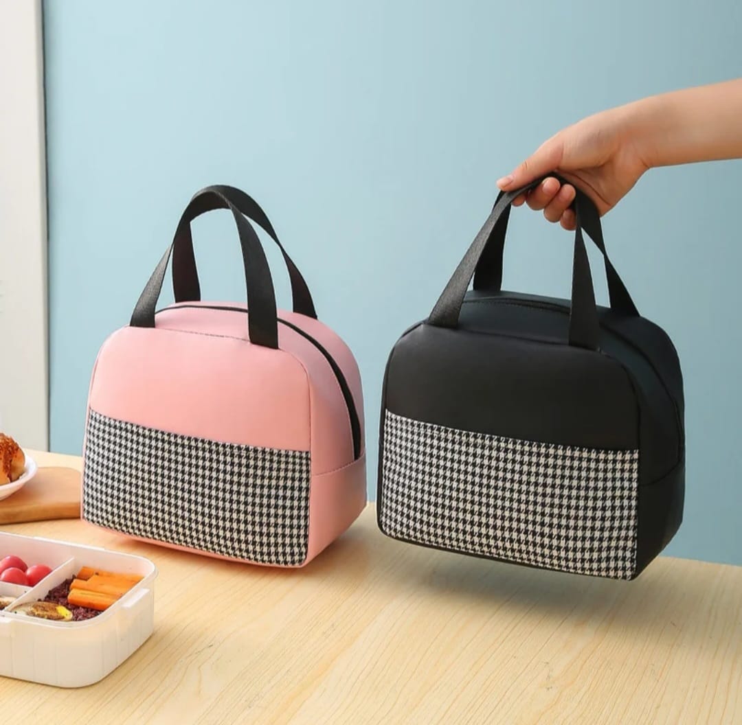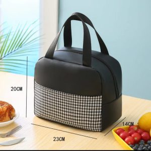 Lonchera rectangular de 23 × 20 × 14 cm, confeccionada en material resistente con acabado negro y bolsillo delantero de patrón tejido en blanco y negro. Cuenta con cierre seguro y asas reforzadas para llevarla cómodamente. Ideal para oficina, escuela o picnic.