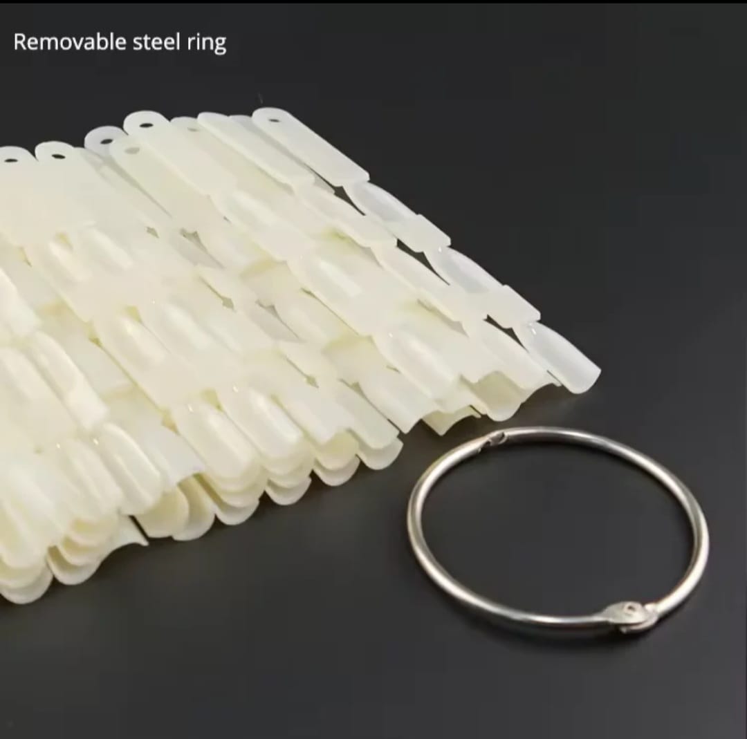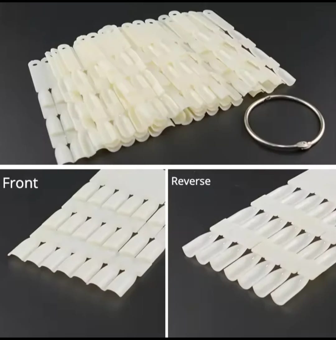 Práctico set de paletas plásticas para muestra de esmaltes, unidas con aro metálico removible. Ideal para salones de belleza, exhibiciones de colores o práctica de diseños de uñas. Cada pieza es resistente y de tamaño compacto para un fácil manejo.