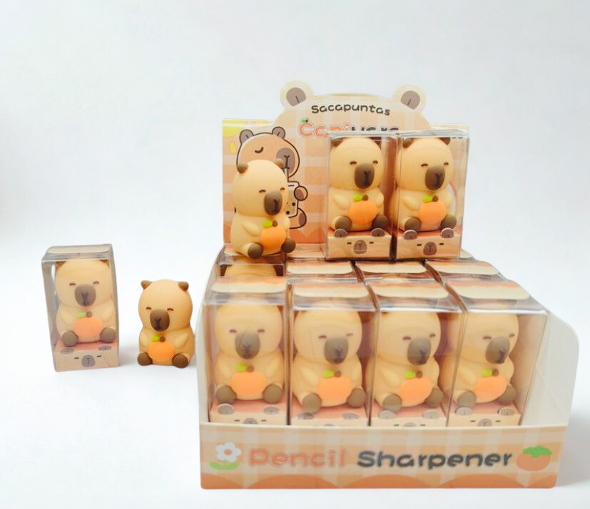 + Free ShippingTiernos sacapuntas en forma de figura de capibara con una naranja sobre su cabeza. Vienen en un paquete de 2 unidades, presentados individualmente en cajas transparentes.