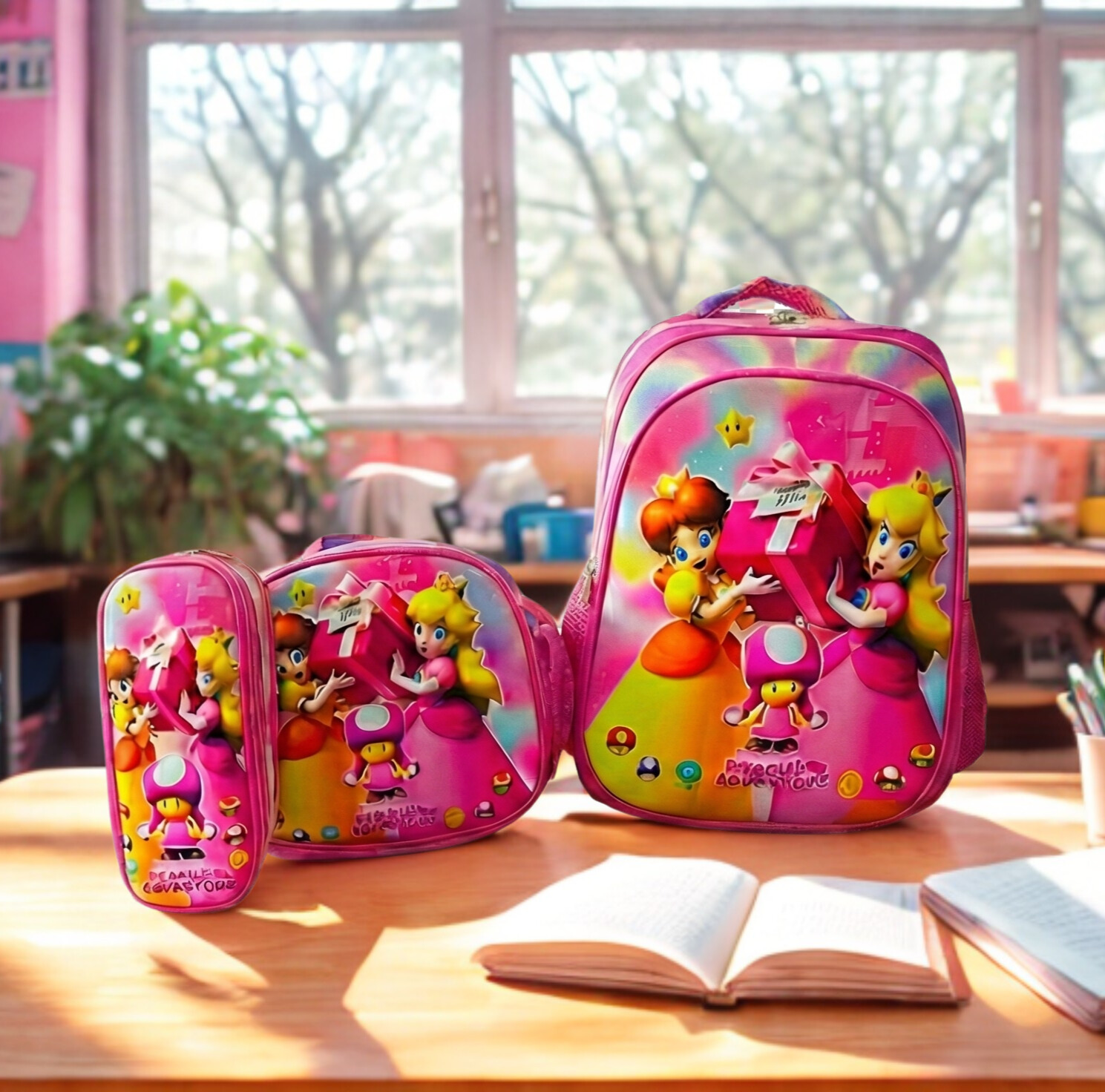 Set Escolar Trío Princesas “Peach’s Adventure” – Mochila (3 Cierres), Lonchera y Cartuchera