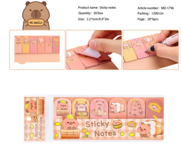 Haz tus recordatorios más divertidos con estos sticky notes con diseño de capibara. Cada set incluye diferentes modelos para marcar páginas, dejar mensajes o decorar tus cuadernos. Son fáciles de pegar y despegar sin dejar residuos.